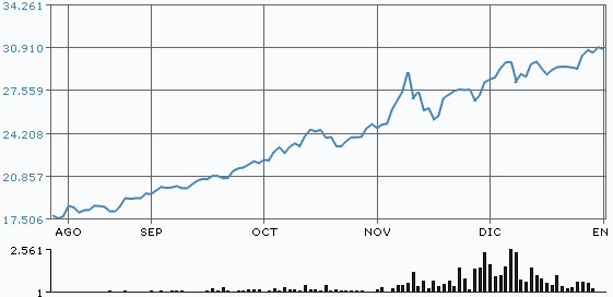 Esta semana vamos a analizar otro de los grandes éxitos del 2010, la plata. De forma mucho menos ruidosa que el oro, pero con mucha más intensidad, los futuros de la plata, tal y como muestra el gráfico, han subido un espectacular 82% en el 2010, sobre todo en los seis últimos meses, dejando muy atrás la subida del 28% del oro o la subida del 31% del cobre, subidas que, en todo caso, tampoco están nada mal.