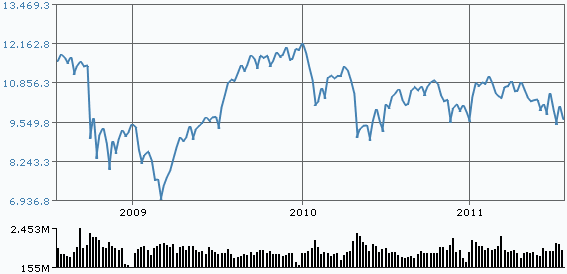 Quede claro que pensamos que en algún momento de los próximos meses podríamos ver niveles de 9.000 o inferiores en el Ibex, pero en Bolsa las cosas no son nunca lineales y tras el duro castigo recibido bien podría haber un rebote. El Gráfico del Ibex de los tres últimos años muestra como el nivel de los 9.500 puntos ha servido en numerosas ocasiones como soporte a los largo de 2010 y 2011 si bien es verdad que el verdadero soporte esta algo mas abajo, alrededor de los 9.200 puntos.