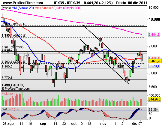 Hoy hemos conocido la notícia de una bajada de tipos de interés de 0.25 puntos básicos que ha situado la rentabilidad del dinero en el 1%. La bolsa no ha cogido a bien este recorte que ha venido acompañado de comentarios de Mario Dragui que ha hecho que al cierre el pesimismo haya llevado al íbex35 a cerrar con algo más de un 2% de pérdidas, situándonos en los 8.461 puntos, con un soporte de medio plazo situado en los 8200 puntos donde parece que vamos a dirigirnos en el muy corto plazo, muy probablemente mañana.
