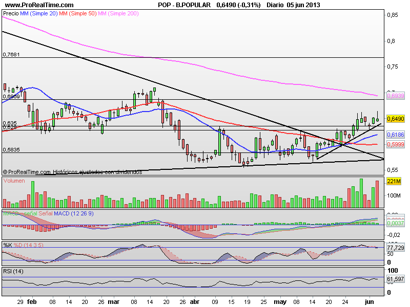 Sesiones, las de ayer y la de hoy, donde el volumen de contratación ha sido sensiblemente más alto que la media de las últimas sesiones. Ruptura del triángulo alcista formado cuando rompióo niveles de 8 euros en la jornada de ayer.