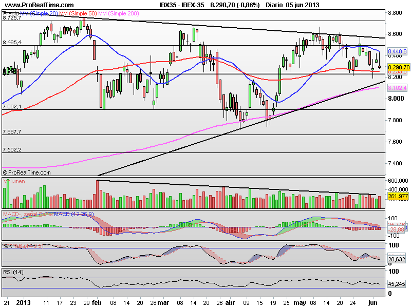 Resistencia en 8.600 puntos, incluso algo inferior, en 8.575 puntos la que tiene ahora mismo nuestro selectivo y un doble soporte, primero en la zona 8.240 puntos y el siguiente en la directriz de medio plazo, que pasa ahora por los 8.175 puntos.