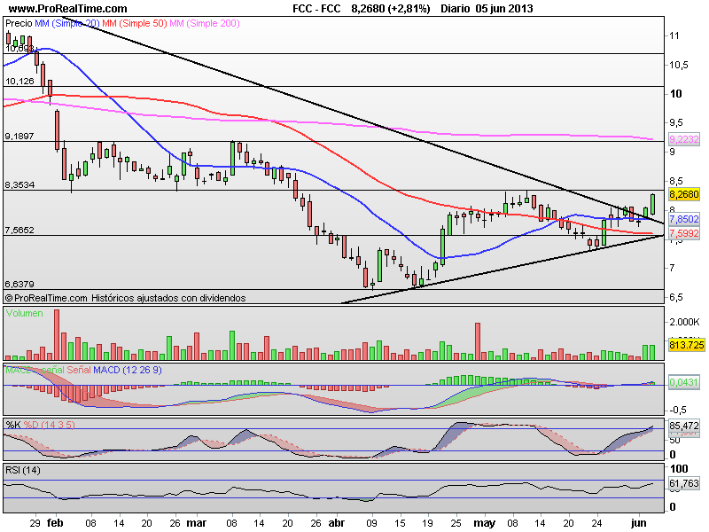 FCC: Un valor que podría hacerlo bien en el corto plazo. La subida de hoy, cercana al 3% ha dejado a los títulos de Fcc a las puertas de romper una de sus primeras resistencias de corto plazo, que se sitúa en los 8.35 euros y que podría abrir las puertas a nuevas revalorizaciones mínimo hacia la zona 9.18 euros, dond se divisa la confluencia de la siguiente resistencia y la Mm200 sesiones que podrían detener su avance.