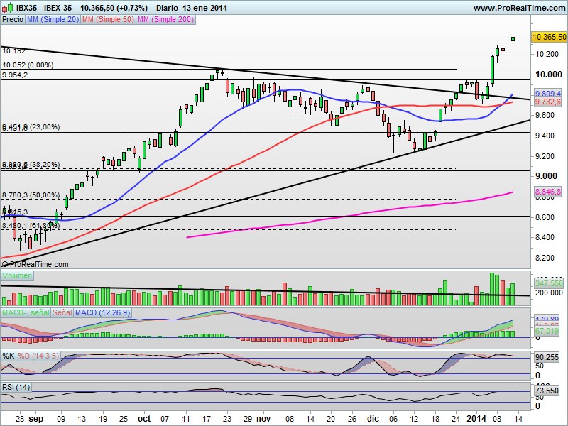 Medias móviles cortadas al alza, Macd sigue generando señales de compra, aunque el RSI y el Estocástico ya nos muestran niveles de sobrecompra extremo en algunos valores.