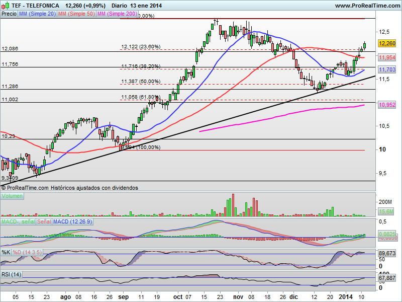 TELEFÓNICA: Alzas del 1% en la sesión de hoy con superación de su principal nivel de resistencia en los 12.12 euros con claras intenciones de ataque a máximos del año y que podría casar con un Íbex en la zona 10.500-10.600 puntos y son esos 12.78 euros donde sería aconsejable deshacer posiciones alcistas en el valor que está teniendo un gran comportamiento tal como previmos en boletines anteriores y ha cogido el relevo de otros títulos más agotados.