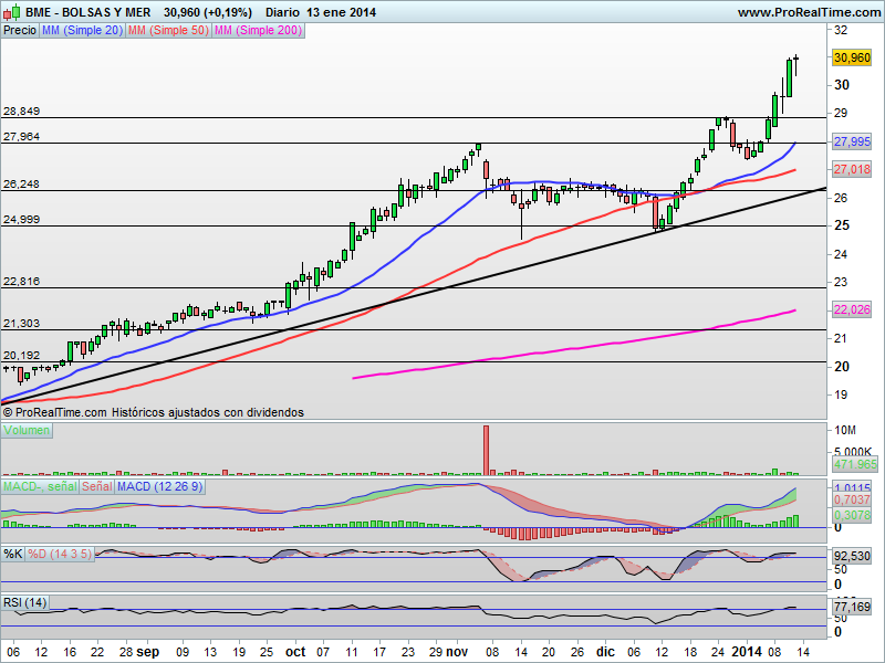 BME: Un valor tremendamente alcista desde que superó la zona clave de los 28.85 euros nivel que ahora mismo estaría situado como stop para toda posición comprada desde estos niveles.