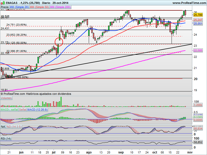 ENAGÁS: Llega a su zona de resistencia y forma un posible doble techo de mercado en la zona de los 26.20 euros. Si el mercado se nos diera la vuelta y consiguiéramos superar niveles de 10.400 puntos en el caso del selectivo español, Enagás sería capaz entonces, sino antes, de superar dicha zona de resistencia asistiendo a un nuevo envite alcista que podría proyectar al valor hacia el nivel de los 27 euros como mínimo.