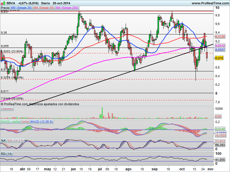 BBVA: Cesiones de más de un 4% hoy al cierre, en conjunto con la gran banca española y europea. Los títulos de Bbva, se sitúan perforando al cierre la zona de soporte correspondiente al 23.60% de Fibonacci del último gran impulso alcista que teníamos formado en los 8.92 euros. A corto plazo, deberíamos esperar una vuelta a los mínimos de este mes de Octubre, siempre hablando en precios de cierre diario, como son los 8.50 euros.