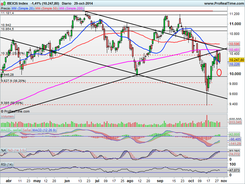 Aquí hay que tener en cuenta un aspecto muy importante, y es que vista la sobrecompra que presenta el selectivo en esta zona, es perfectamente factible, además de coherente que recorte en precio hacia niveles de 9.950 puntos podría ser una posibilidad muy clara para que se pudiera tomar posiciones en determinados valores a precios razonables.