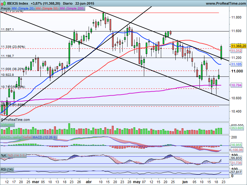 Los principales índices de la renta variable del Viejo Continente se anotaron, en la jornada de hoy, importantes ganancias que, en el caso del selectivo español fue del 3.87% situando su cierre en los 11.368 puntos. Todo parecía apuntar a que tan sólo alcanzaríamos el primer punto de referencia en cuanto a nivel clave de resistencia en el selectivo español, esto es los 11.200 puntos, pero a medida que avanzaba la sesión y con el Dax y el Dow Jones acompañando estas subidas, hemos conseguido cerrar por encima, incluso, de esta resistencia intermedia.