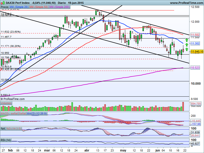 Ataque a primera resistencia intermedia, cuya superación, daría paso a un nuevo ataque a la directriz bajista que quedaría superada si se perforararn al alza los 11.582 puntos. Mientras no se produzca este hecho, las probabilidades que asistamos a varias jornadas de consolidación incluso de reacción, quedarían encima de la mesa.