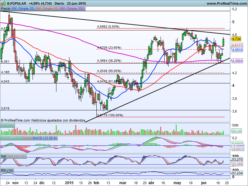 Situado en predisposición de superar la directriz bajista y con un buen aspecto técnico, nos deja un gráfico interesante a día de hoy, donde, apreciamos una zona lateral que va desde el nivel de los 4.35 hasta los 4.85 euros aproximadamente , aunque nos fijamos en este valor ya que si el conjunto del mercado sigue tirando al alza, lo más probable es que supere la zona de resistencia y por donde pasa ahora mismo el canal bajista de medio plazo, es decir, la zona 4.80 euros, cuya superación, nos daría un recorrido alcista para los títulos de Popular muy interesante tendente a buscar la zona de resistencia entorno a los 5.20 euros por título.