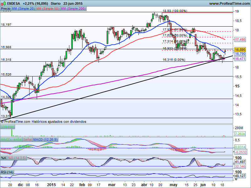 Se sujeta perfectamente en la directriz alcista de medio plazo que se extiende desde aproximadamente niveles de 13.30 euros hasta los máximos de este ejercicio marcados el pasado mes de Abril, en niveles de 19 euros.