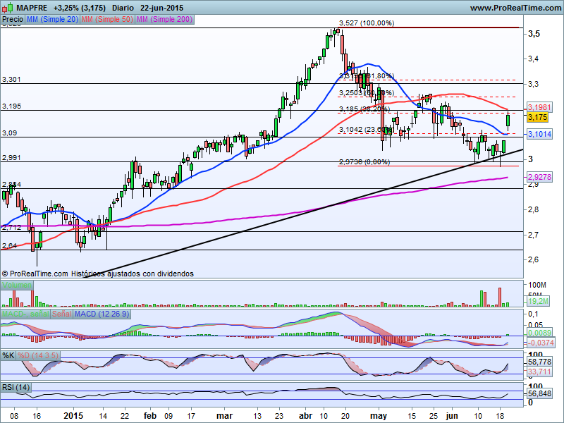 El apoyo ofrecido esta misma semana en zona de suelo, ha propiciado un escape alcista, en la sesión de hoy, en busca de su primera zona de resistencia justo en el nivel de corrección proporcional Fibonacci al último impulso bajista, esto es, la zona 3.18 euros (38.20%), proporcionándonos una ventana de trading de incorporación de corto plazo con objetivos en la zona 3.30 euros, y stop justo en el hueco dejado en la sesión de hoy, en 3.07 euros, siempre que supere, también en cierres, niveles de 3.18 euros.