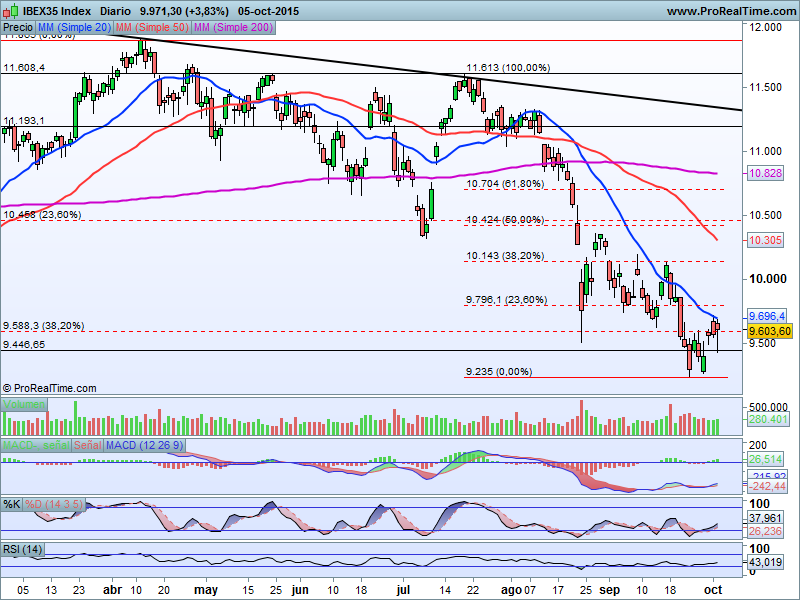 De confirmar mañana martes cierres por encima de 9.800 puntos, confirmaría el patrón de giro alcista iniciado en la jornada de hoy, y sí que nos adelantaría un rebote más consistente y continuado.