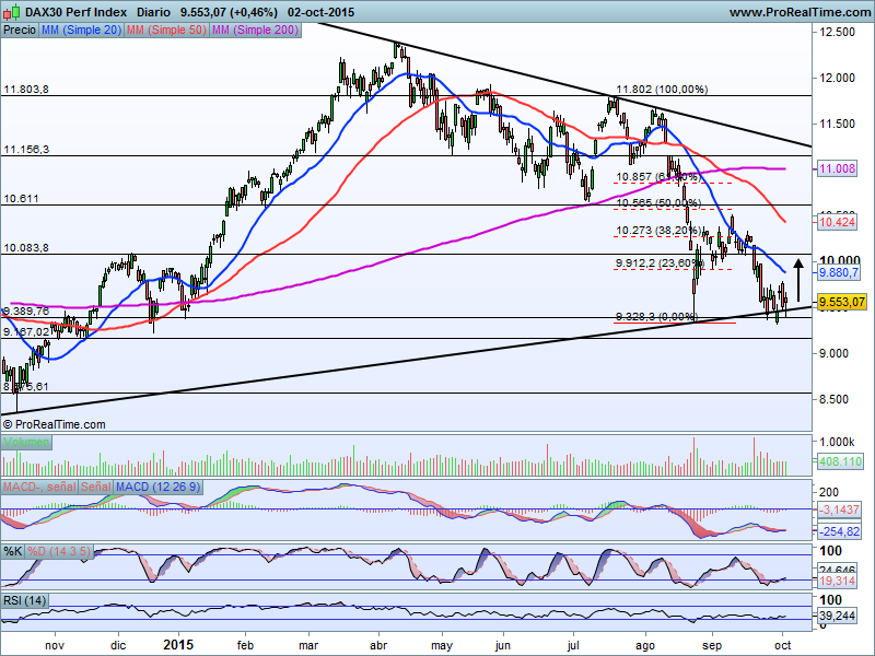 Rebote técnico, por sobreventa que nos deja una vela en forma de martillo aunque algo lejos de su zona de máximos pero con las esperanzas puestas en que más pronto que tarde podríamos ver niveles de 10.150 puntos, como zona de resistencia intermedia, cuya superación, abriría las puertas a un nuevo tramo alcista en busca del cierre de algunos huecos bajistas que tenemos formados en zonas próximas dicha resistencia.