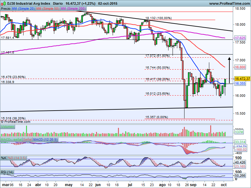 Ligero aumento en el volumen de negociación en zonas próximas a los 16.000 puntos que han servido, al menos por el momento, para rebotar de forma técnica. Necesitaremos ver un cierre semanal por encima de 16.600 para confirmar el patrón de giro alcista en el principal índice de Wall Street.