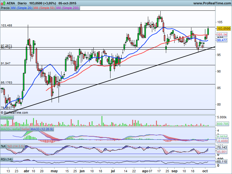 Un valor que ya tenemos incluido en nuestra cartera, a precios sensiblemente inferiores, pero que sigue en tendencia alcista de corto y medio plazo. Aena ha formado un claro rebote desde la directriz que se extiende desde prácticamente el pasado mes de Abril hasta la actualidad, y se enfrenta en estos momentos a su primera resistencia que situamos en niveles de 103.50 euros por título.