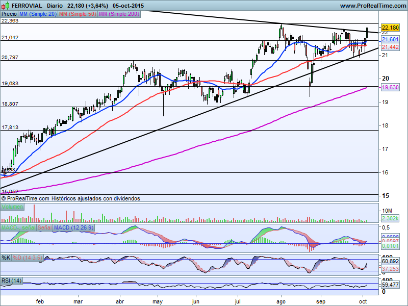 En el caso de Ferrovial, el valor se mantiene intacto dentro de una clara tendencia alcista de fondo, con una formación de máximos y mínimos relativos crecientes en gráfico diario y dibujando una formación de banderín alcista de este mismo período con ruptura, ya confirmada, en la sesión de hoy de su parte alta, aunque con una zona de resistencia que situamos en sus máximos anuales en niveles de 22.35 euros por título.