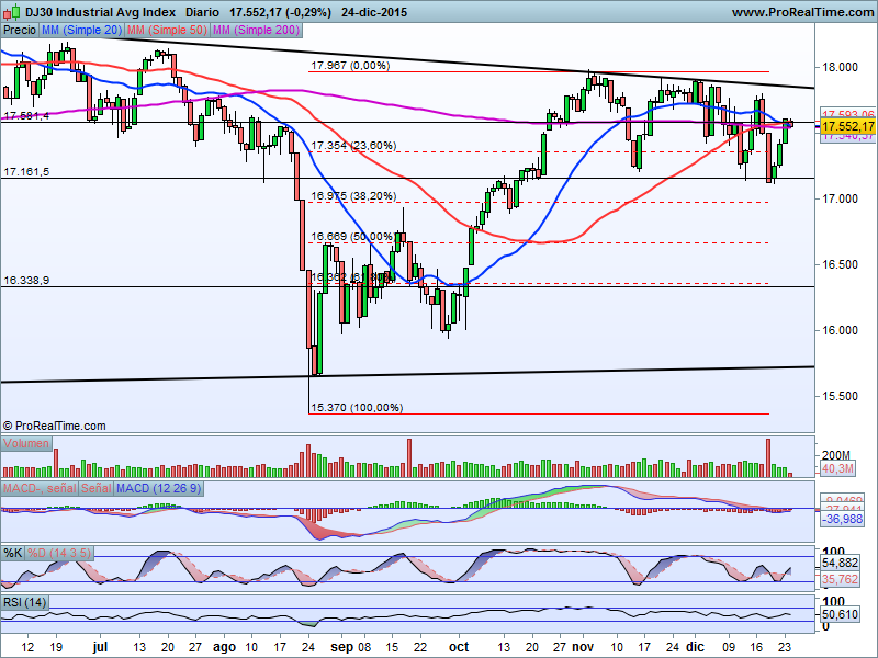 En el caso del Dow Jones, pocas variaciones respecto a lo comentado en anteriores boletines, y es que se encuentra titubeante entre la zona de soporte de 17.160 puntos y la resistencia de los 17.800 puntos y entornos, sin a penas definición y lateralizando entre estos dos niveles.