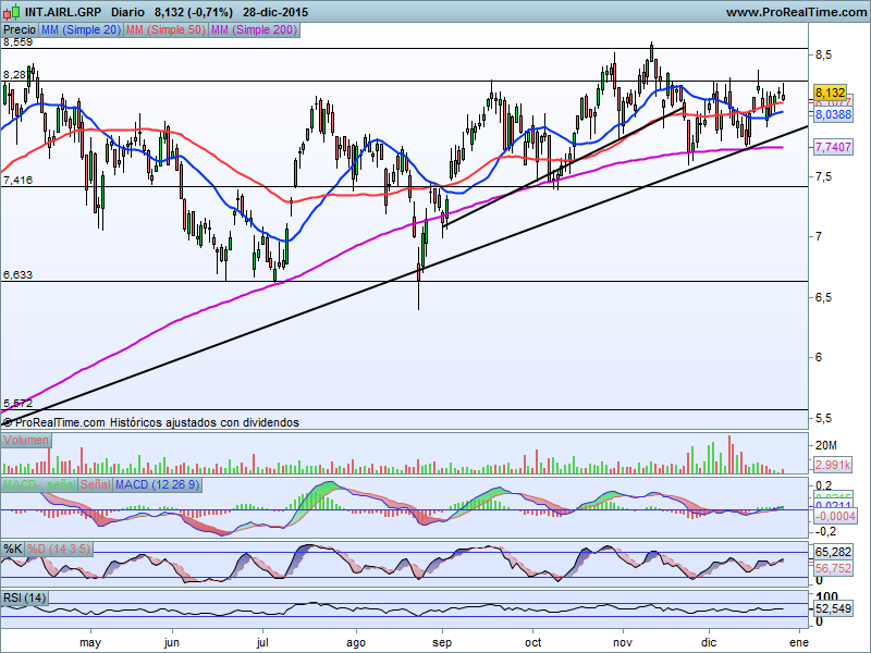 Uno de los pocos valores dentro del selectivo español que mantiene su sesgo alcista de corto y medio plazo, inmerso dentro de un canal alcista de medio plazo con formación de máximos y mínimos relativos crecientes en diario desde prácticamente el primer trimestre del ejercicio y favorecido por la caída en el precio del crudo, IAG se encuentra en una fase importante, ya que si supera los máximos alcanzados en el pasado mes de Noviembre, es muy posible que inicie un nuevo tramo alcista interesante.
