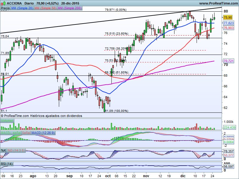 Hoy por hoy y si atendemos a su gráfico técnico, cualquier retroceso tendente a buscar la zona 75 - 75.50 euros, se podría tomar como una opción interesante de entrada para trading de muy corto plazo con objevos precísamente en esos 80 euros y stop por debajo de los mínimos relativos anteriores incluso intradía que marcó Acciona en la jornada del pasado 11 de Diciembre. Hablamos de un stop de posición por debajo de los 74 euros por título.