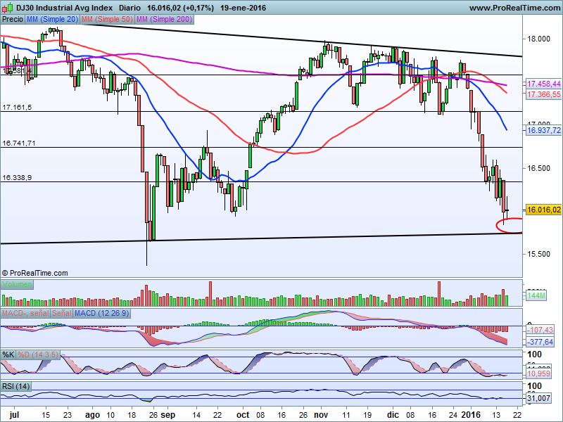 En el aspecto técnico, observamos un claro recorte desde la zona cercana a los 17.700 puntos donde cotizaba a finales del ejercicio 2.015 hasta el nivel de cotización actual rondante a los 15.700 puntos, es decir, un 12% de caída en tan sólo 20 dias, algo nada normal en Wall Street.