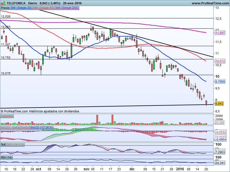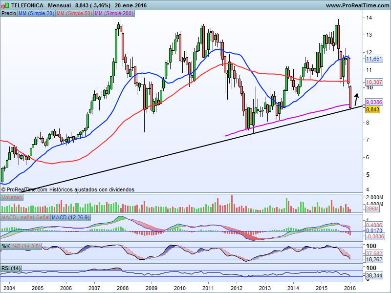 Hoy, hemos elevado exposición en bolsa de la mano de la teleco para nuestros clientes SMS esperando un rebote técnico en las bolsas mundiales incluso del precio del crudo que pueda llevarnos a conquistar, en el caso de Telefónica, la zona de los 9.50 euros, incluso. La tendencia sigue siendo la bajista para el corto y medio plazo pero para el largo su tendencia es netamente alcista. Lo visto hasta ahora se corresponde con un rebote desde zonas de soporte que es justo la directriz de este período unida a su media móvil de 200 sesiones que pasa muy cerca de estos niveles.