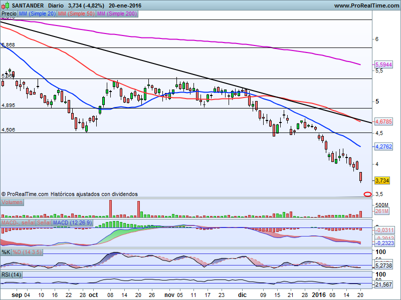 Caso que asistiéramos a una vela en forma de envolvente alcista y mañana se cerrara por encima de 3.87 euros podría igualmente iniciarse cobertura en el valor con objetivos en 4.20 euros y stop en los mínimos de hoy. En cualquiera de los escenarios planteados sería factible lanzarse a por una operación de trading en Santander.