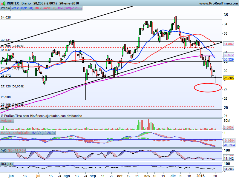 La zona de mínimos de hoy está muy cerca del nivel de corrección proporcional Fibonacci 50% al último gran impulso alcista que arrancó en Octubre de 2.014 y que se extendió hasta los máximos del 2.015 en 35.40 euros. Hablamos de los 27.12 euros. Hoy el mínimo intradía se ha dado en niveles de 27.75 euros por lo que el valor ha quedado todavía un 2% de dicha zona.