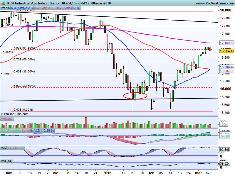 En los últimos dias, el Dow Jones de industriales se está topando con su zona de resistencia más importante como son los 17.000 puntos que, además de ser el 61.80% de Fibonacci a todo este tramo bajista que hemos comentado, es un nivel psicológico de resistencia que mantiene a raya a los alcistas.
