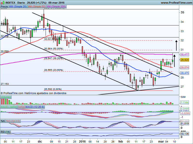 A corto plazo, obsrevamos una pauta de máximos y mínimos decrecientes en gráfico diario perfectamente canalizado, una estructura que ha conseguido romper al alza con la superación, el pasado 1 de Marzo de los 29 euros por título.