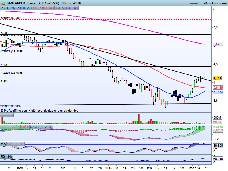 En cuanto al Banco de Santander, y atendiendo a razones puramente técnicas, observamos una formación de triángulo que trata de resolver, en este caso al alza, con la superación de niveles de resistencia como son los 4.22 euros que es justamente el 23.60% de corrección proporcional Fibonacci al último tramo bajista que arrancó en Septiembre de 2.014 hasta mínimos interanuales en 3.30 euros.