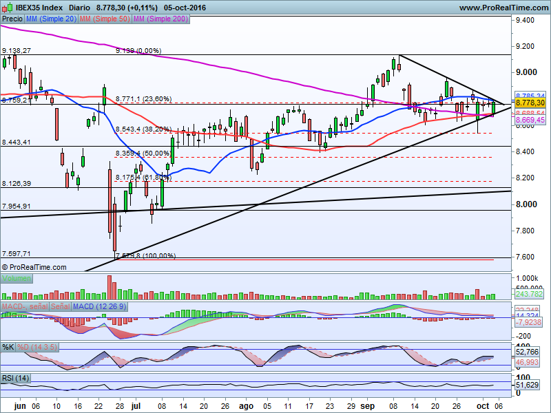 El selectivo de la bolsa española cierra con una subida del 0,11% hasta los 8.778 puntos. El Ibex 35 disminuye las pérdidas iniciales cercanas al 1%, y sigue en su lucha de mantenerse por encima del nivel psicológico de los 8.700 puntos. Las bolsas europeas, que se mueven en la misma línea, se enfrentaron a un día de sentimiento negativo con el programa de compra de activos del Banco Central Europeo (QE) en el punto de mira, en una jornada intensa en referencias macroeconómicas. Los inversores también analizaron evolución del Deutsche Bank y las novedades en torno al Bréxit, que devuelve a la libra al mínimos con el dólar de 31 años.