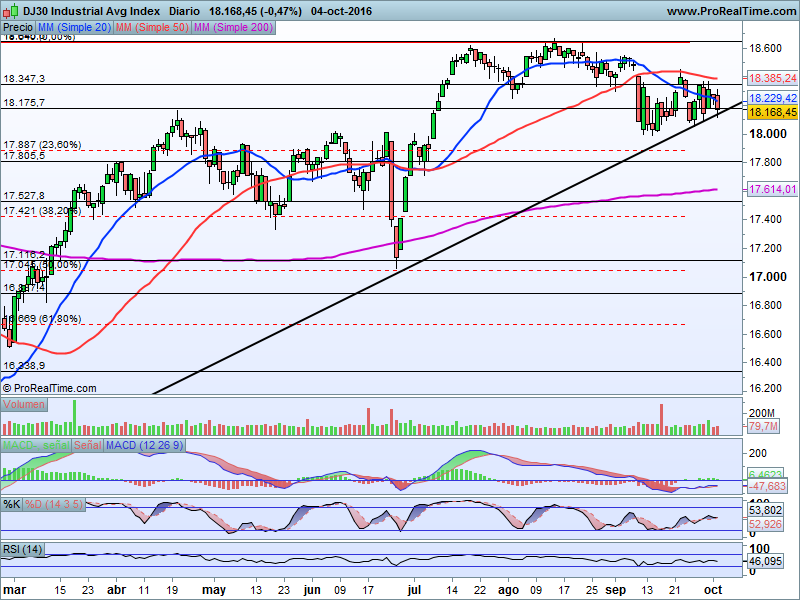 El Dow Jones de Industriales, así como el S&P500 siguen moviéndose en un lateral que en este caso comprende alrededor de un 5% entre su parte más baja y su zona de resistencia.