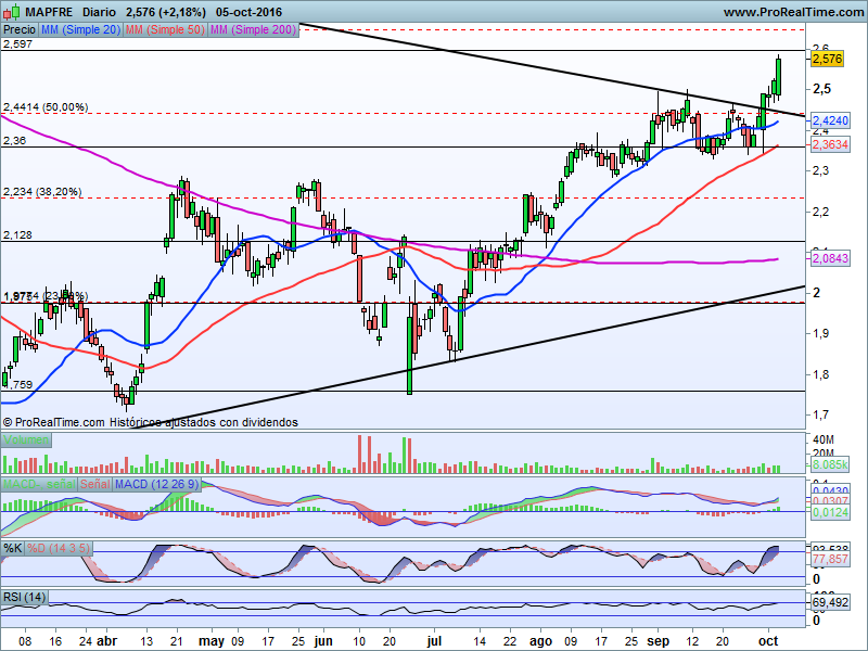 Con la superación de la zona de los 2,45 euros, que no es una zona cualquiera, sino es la tangencia entre el 50% de corrección proporcional y la directriz bajista que se extiende desde dichos máximos, el valor podría tener cierto tirón alcista en busca de los 2,65 euros por título, que son a su vez, el último de los niveles proporcionales 61,80%, por tanto una resistencia muy fuerte para Mapfre.