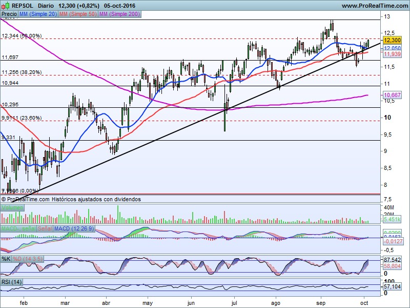 En niveles actuales de cotización podría estar ofreciéndonos una oportunidad de trading de muy corto plazo con stop precisamente por debajo de los mínimos del pasado 27 de setiembre, por debajo de 11,50 euros por título, en precios de cierres.