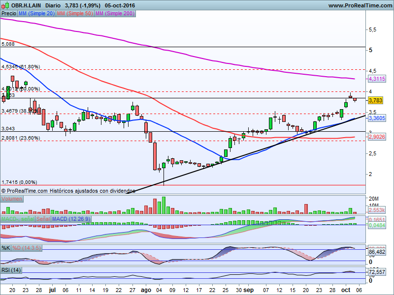 En la sesión de hoy hemos asistido a un retroceso desde zonas de resistencia importantes como son los 4,00 € por título que han provocado recortes tendentes a buscar la directriz alcista de corto plazo que ha desplegado la constructora y que ahora mismo pasa por niveles de 3,5 euros el título.