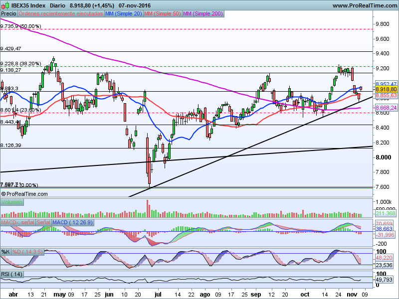 Es muy posible que mañana también asistamos a una jornada consolidativa marcada por el compás de espera para conocer el resultado de las elecciones de Estados Unidos, algo que provocará, bajo nuestro punto de vista, un rebote en las bolsas a corto plazo si gana el candidato demócrata, algo que podría llevar al selectivo de la bolsa española a buscar un nuevo ataque a la resistencia que tenemos configurada en la zona e inmediaciones de los 9.200 puntos. Si esto sucede, no tendremos ninguna nueva parada hasta niveles por encima de los 9.400 puntos.