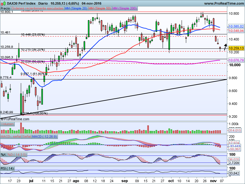 Por su parte, el principal índice de la bolsa alemana, y después de formar una estructura muy clara de doble techo en las inmediaciones de los 10.800 puntos, ha recortado hasta buscar el nivel de soporte correspondiente a los 10.215 puntos, que son a su vez, el 38,20% de Fibonacci de todo el tramo alcista que arrancó en los mínimos del pasado mes de junio.