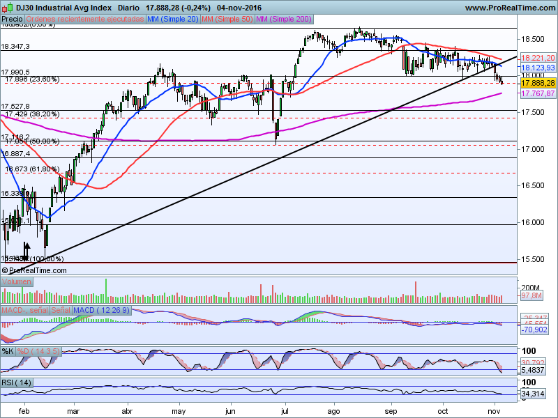 Técnicamente, el Dow Jones de industriales pierde parte del terreno ganado en los últimos meses desde que trató de atacar su resistencia que se sitúa la zona de los 18.650 puntos y comenzó a entrar en una fase de reacción y lateralidad donde no ha sido capaz de superar, en ningún momento, sus respectivas zonas de máximos relativos anteriores, algo que ha llevado a este índice a buscar apoyo en el primero de los niveles de soporte proporcional Fibonacci al último gran movimiento alcista, en los 17.900 puntos.