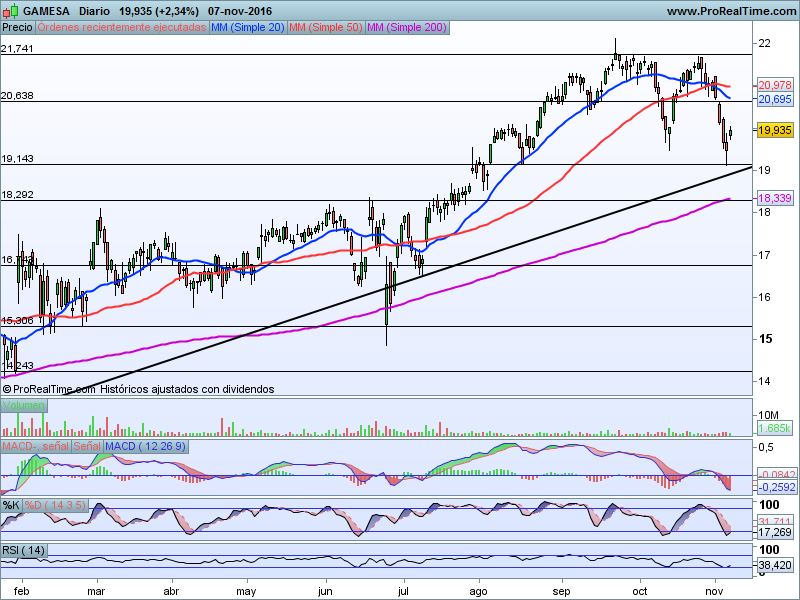 De entre los valores destacados para mañana y próximas sesiones, y una vez revisados las empresas pertenecientes al selectivo de la bolsa española, centramos nuestra atención en Gamesa: