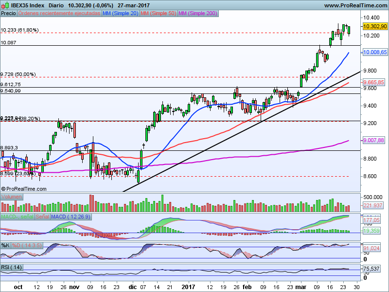 Técnicamente, el selectivo de la bolsa española comienza a crear una especie de resistencia en los máximos alcanzados en los últimos días. Así, la zona de los 10.300 puntos y entornos está siendo un hueso duro de roer, al menos en el muy corto plazo. Mañana martes, se antoja una jornada clave, ya que si consigue superar estos máximos, podríamos ver de forma inmediata la zona de los 10.400-10.500 puntos.