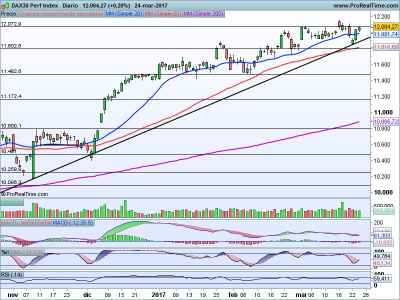 Técnicamente, sigue manteniéndose por encima de la directriz alcista de medio plazo que se extiende desde los mínimos marcados el pasado mes de noviembre en la zona de los 10.200 puntos hasta su nivel actual, encontrando resistencia importante en dichos 12.070 enteros que fueron batidos hace unos días en falso para luego meternos dentro del lateral.