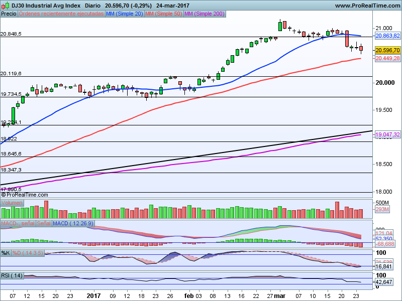 Comienza a esfumarse el efecto Trump en las bolsas de Wall Street, ya que parece ser que han iniciado lo que se conoce como una corrección pura y dura y en el más estricto sentido de la palabra, desde su zona de máximos alcanzada hace algunas semanas en los 21.130 puntos y entornos.