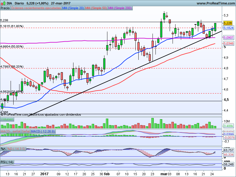 Habrá que permanecer vigilante a este nivel de resistencia (5.20 eu) ya que su superación en precios de dos cierres consecutivos o uno semanal, lelvaría directamente a DIA a alcanzar prácticamente el 100% de esta corrección proporcional, es decir, la zona de los 5.70 y los 5.80 euros.