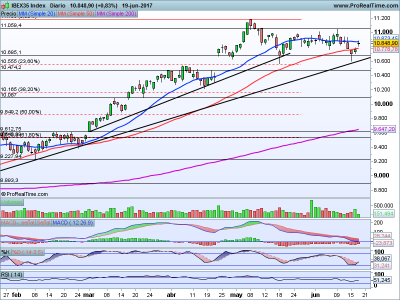Comenzamos la segunda mitad del mes de junio de la misma forma que el pasado mes de mayo, con una lateralidad incomprensible, que dura ya demasiado y que comprende las zonas entre los 10.685 por abajo y los 11.000-11.200 puntos por arriba.
