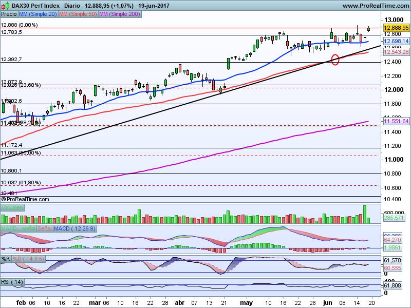 El índice alemán se ha anotado una subida del +1.07% y se topa con su resistencia más inmediata en la zona de los 12.890 puntos.