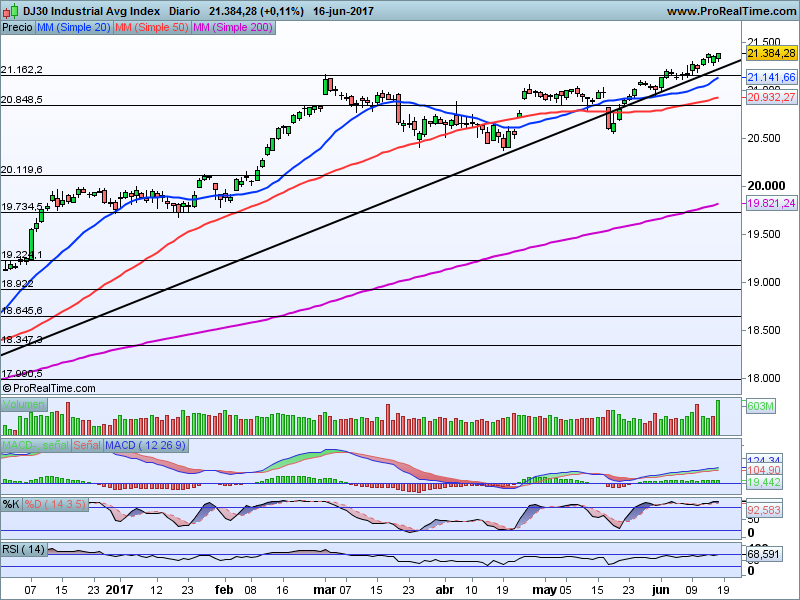 En el caso del Dow Jones, este índice sigue marcando nuevos máximos a día de hoy y se encarama hacia la cota de los 21.500 puntos. Al contrario que en Europa, los americanos no temen a las subidas, ni tienen mal de altura. Sus índices siguen marcando nuevos máximos.