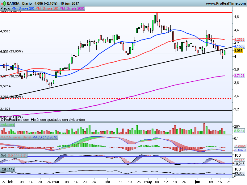 En la sesión de hoy, los títulos de Bankia han obtenido una revalorización importante del +2.10% y han situado su nivel de cotización en los 4.08 euros por acción. El efecto contrasplit comienza a notarse en sus niveles.