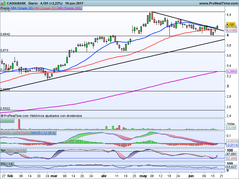 En cuanto a los títulos de Caixabank y con la subida de hoy, rompen al alza la secuencia de máximos y mínimos relativos decrecientes de corto plazo que había descrito desde prácticamente inicios del mes de mayo.